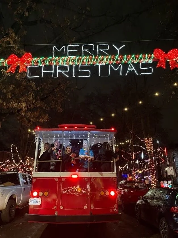 Once aboard the vintage trolley, the adventure begins! We’ll set off on a 3-hour journey to explore some of STL’s most iconic holiday stops. Each tour may vary, but possible highlights include Winterfest at Kiener Plaza, Candy Cane Lane, Window Walk at Central West End, Tilles Park, festive neighborhood displays, and even a visit to a lively pop-up Christmas bar! Please note: stops are not guaranteed and may vary nightly based on traffic, timing, and availability.